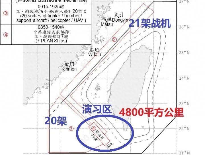 其中34架次战机分别从台海的中部及西南空域进入,抵近台岛。同时在台岛的西南及东部海域共有14艘军舰及1艘公务船配合行动。这些舰船分别在西南方向及台岛的东部。